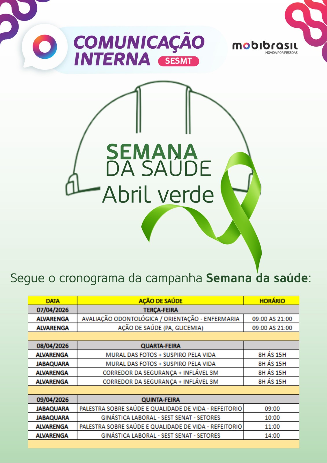 A integração com o Abril Verde traz o foco para a segurança no trabalho e a prevenção de doenças ocupacionais. O movimento nacional ganha força na MobiBrasil com orientações que visam garantir um ambiente laboral mais seguro, culminando na reflexão sobre o Dia Mundial da Segurança e Saúde no Trabalho, celebrado em 28 de abril.